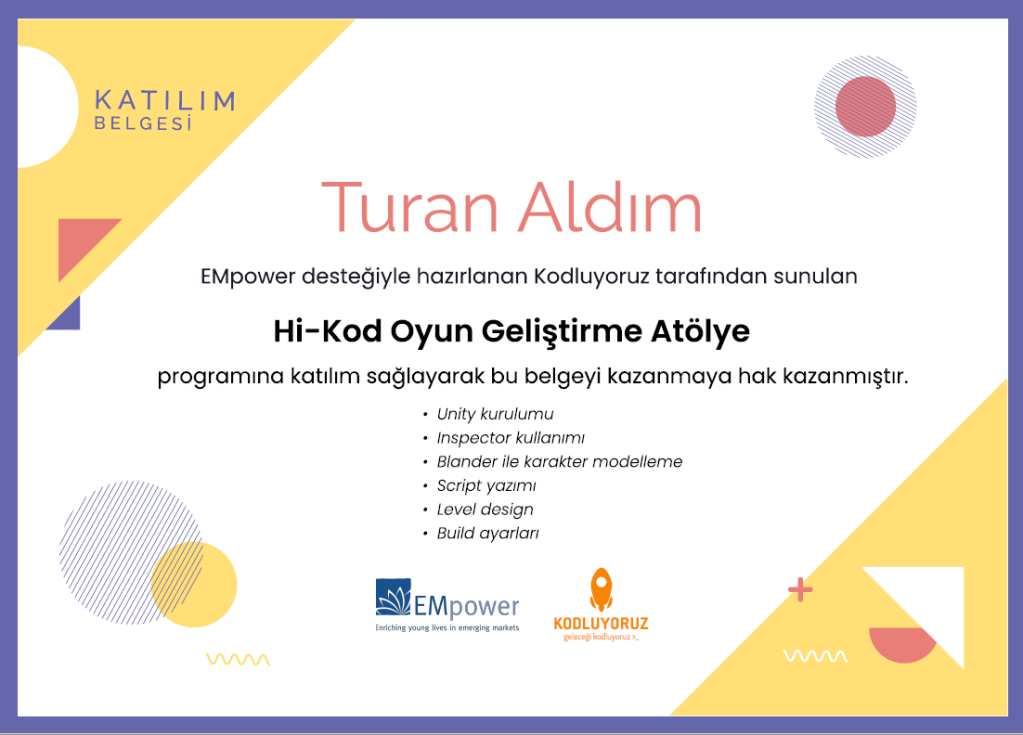 Ben Turan Aldım. Lisede veri tabanı bölümü okudum. C# ve SQL eğitimleri aldım. Liseden sonra Tasarım alanında devam etmek istediğim için 3D tasarıma yöneldim. 3 yıldır da 3D Tasarımla ilgileniyorum. Temmuz 2022’de Kodluyoruz bünyesinde ki Hi-Kod Oyun Geliştirme Atölyesine katıldım. 1 Aylık eğitim süreci bittikten sonrada atölyede 3D artist olarak gönüllü mentorluk yapmaya başladım. Bu süreçte atölyede 3D tasarım dersleri verdim ve bir çok projenin geliştirilmesi konusunda öğrencilere yardımcı oldum. Aynı zamanda kendimi geliştirmeye de devam ettim. Zaman zaman ekiplere katılarak gamejamler de projeler geliştirdim. Mart 2023’de Bycodec Games’de staj yapmaya başladım. 3 Ay süren staj döneminden sonra aynı şirkette tam zamanlı olarak çalışmaya başladım. 2 yıllık bir süreçten sonra Mart 2025 de çalıştığım şirketten ayrılarak kendi projemi geliştirmeye başladım. Şu anda da tam zamanlı olarak kendi projemi geliştirmek için çalışıyorum. Benimle tam zamanlı, yarı zamanlı ve freelance olarak çalışmak için iletişime geçebilirsiniz.